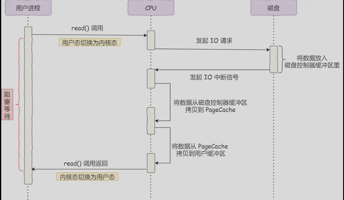 期间共发生了 4 次用户态与内核态的上下文切换,因为发生了两次系统调用,一次是 read() ,一次是 write(),每次系统调用都得先从用户态切换到内核态,等内核完成任务后,再从内核态切换回用户态。