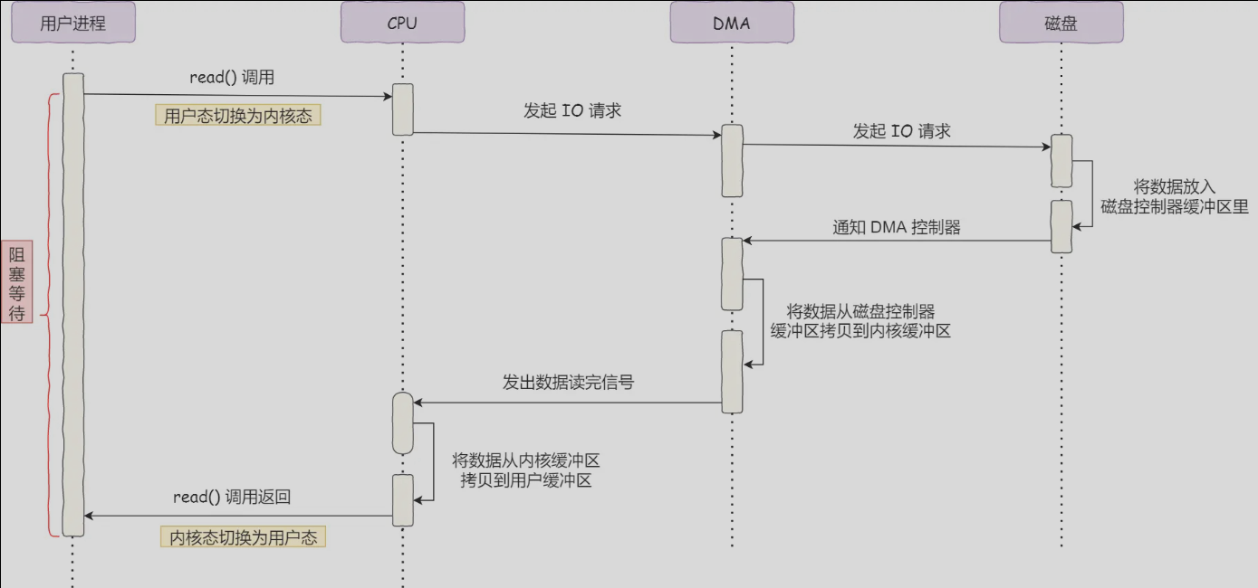 CPU 不再参与「将数据从磁盘控制器缓冲区搬运到内核空间」的工作,这部分工作全程由 DMA 完成。