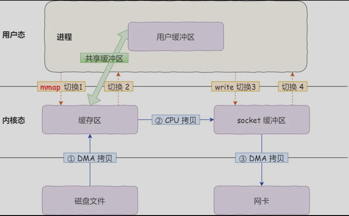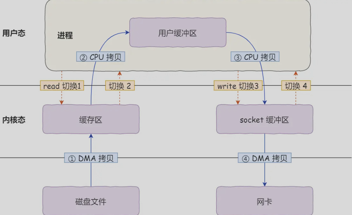 还发生了 4 次数据拷贝,其中两次是 DMA 的拷贝,另外两次则是通过 CPU 拷贝的: