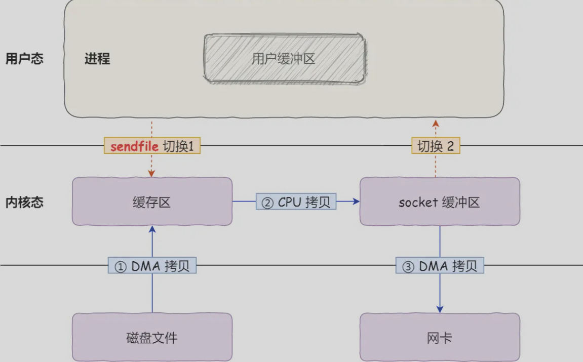 其次,该系统调用,可以直接把内核缓冲区里的数据拷贝到 socket 缓冲区里,不再拷贝到用户态,这样就只有 2 次上下文切换,和 3 次数据拷贝。