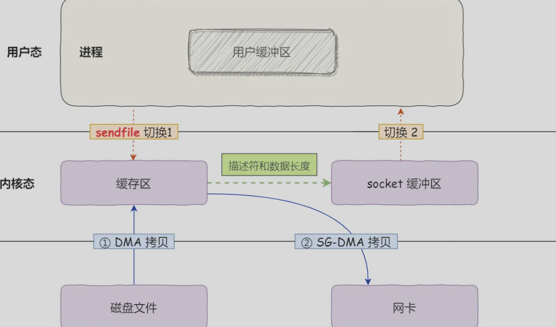 如果网卡支持 SG-DMA(The Scatter-Gather Direct Memory Access)技术(和普通的 DMA 有所不同),可以进一步减少通过 CPU 把内核缓冲区里的数据拷贝到 socket 缓冲区的过程。